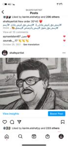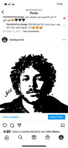 فيما أعرب عن حبه لرسم البورتريه لأنه يحاكي الواقع من خلال التفاصيل الدقيقه للوحه… وأكمل اختار الرسم بالحبر لكي يكون مختلف عن الباقي ويقدر من خلاله أن يختص في كل ما يخص الحبر.