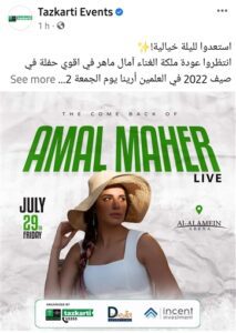 و نشرت شركة تذكرني من خلال صفحتها الرسمية عن إعلان الحفل و جاء فيه : ” استعدوا لليلة خيالية ! انتظروا عودة ملكة الغناء آمال ماهر في أقوي حفل في صيف 2022 في العلمين أرينا ، انتظروا تفاصيل الحجز قريبا ” .