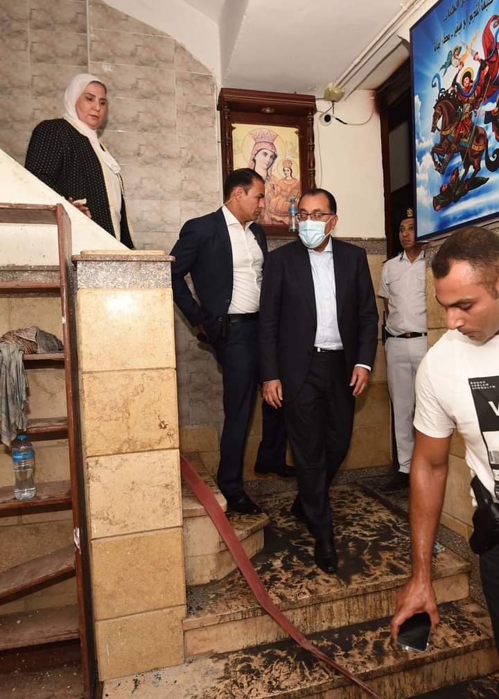 -تفقد الدكتور:”مصطفى مدبولي”، رئيس مجلس الوزراء، كنيسة الشهيد “ابو سيفين” في منطقة المنيرة بمحافظة الجيزة، للوقوف علي تطورات موقف الحادث المؤلم، والحريق الذي وقع صباح اليوم بالكنيسة، برفقة الدكتور:”خالد عبد الغفار” وزير الصحة والسكان، والسيدة:”نيفين القباج، وزيرة التضامن الاجتماعي، واللواء:”هشام آمنة”، وزير التنمية المحلية، واللواء:”احمد راشد” محافظ الجيزة، وعدد من قيادات وزارة الداخلية، وقساوسة الكنيسة.