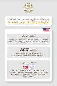 جاء ذلك حرصا من وزارة التربية والتعليم والتعليم الفنى على الرد على الاستفسارات الخاصة بالمعايير التى تم وضعها بشأن الامتحان المصري EST كإمتحان مؤهل وحيد لطلاب الدبلومة الأمريكية، لتنسيق الجامعات للطلاب الحاصلين على شهادة الدبلومة من مدارس داخل مصر فقط أو الحاصلين عليها من جميع أنحاء العالم، والاستفسار عن امتحان ACT وال Matching على مستوي الشهادة المادة الواحدة ونظرا لان اختبار EST تم تطبيقه من العام الماضي.