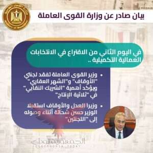 وكانت عملية الاقتراع في الإنتخابات العمالية التكميلية قد بدأت أمس السبت في 5 مجالس ادارات وحدات تابعة للقطاع العام وقطاع الأعمال العام وهي شركات:النيل للمجمعات الاستهلاكية،والنصر لصناعة السيارات،والكراكات المصرية،والحديد والصلب للمناجم و المحاجر،والإنتاج الحربي لنظم المعلومات،وكذلك في لجنة نقابية بشركة النصر للسيارات،حيث تفقد فيها الوزير شحاتة،امس لجان إنتخابية بشركتي الكراكات المصرية بالمهندسين،والنيل للمجمعات الإستهلاكية بمدينة نصر..وبحسب بيان صحفي عن “الوزارة “،تأتي هذا العملية الانتخابية استكمالا للدورة النقابية 2022-2026،وتنفيذاً لأحكام القانون رقم 18 لسنة 2018، بشأن تنظيم انتخاب ممثلي العاملين في مجالس إدارة الوحدات التابعة للقطاع العام، وقطاع الأعمال العام،واللجان النقابية ،ولأحكام قانون المنظمات النقابية العمالية وحماية حق التنظيم النقابي الصادر بالقانون رقم “213” لسنة 2017 وتعديلاته ،والقرار الوزاري رقم 72 لسنة 2023.