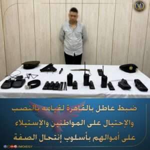 عقب تقنين الإجراءات تم ضبطه وبحوزته (سيارة – طبنجة صوت معدلة – 3 جهاز لاسلكى خاصين بأفراد أمن إدارى – قيد حديدى – 2 صورة بطاقة رقم قومى “مزورين”)..وبمواجهته إعترف بقيامه بالنصب والإحتيال على المواطنين بأسلوب إنتحال الصفة وقيامه بتعديل بيانات بطاقة الرقم القومى من خلال أحد التطبيقات ، وأقر بإرتكابه عدد (4) وقائع نصب بذات الأسلوب وأن السيارة المضبوطة بحوزته من متحصلات نشاطه الإجرامى.