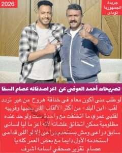 تصريحات أحمد العوضى عن اعز اصدقائه عصام السقا كتب أسامه اشرف نشر مؤخرا الفنان احمد العوضي عبر صفحته الرسمية للفنان عصام السقا وقال لو طلب منى أكون معاه فى خناقة هروح من غير تردد لقب «ابن البلد» من اكثر الألقاب اللي بحبها وقريبه لقلبى عمري ما اتخنقت مع واحدة ست ولوحد عنده مظلومية ممكن اتخانق علشانه لأنه اعز ما ليا لسانى سابق دراعى ومش بستخدم دراعى إلا لو اللى قدامى استخدمه الأول دايما مع بعض العمر كله يا عصام وما يحرمنيش منك ابدا يا اخويا وانى مهما اتكلمت عنك مش هعرف أوصف كلامي ليك
