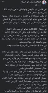 نشرت الشاعرة يمني أبو السباع علي موقع الفيس بوك الخاص بها استغاثه وكتبت ، أنا بطلب استغاثه أنا لو موت أو انتحرت هيكون بسبب أمي ،كذلك وبسبب رفضي تنمر أبنت خالتي قامت أمي بسكب لتر من الجاز وولعت فيها.